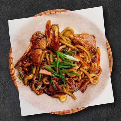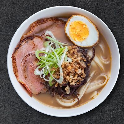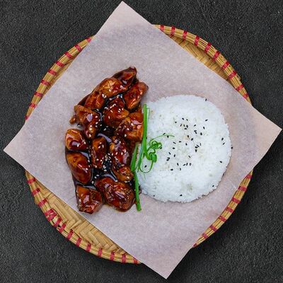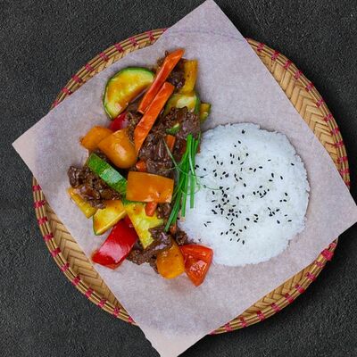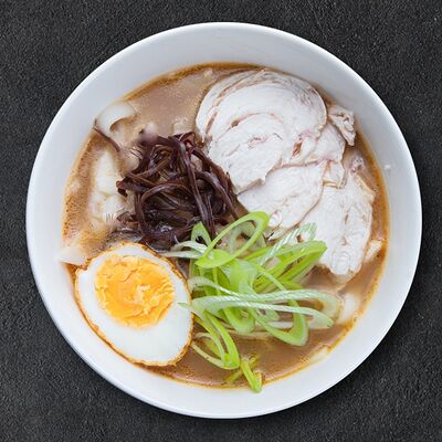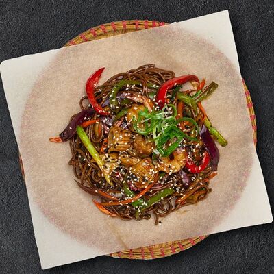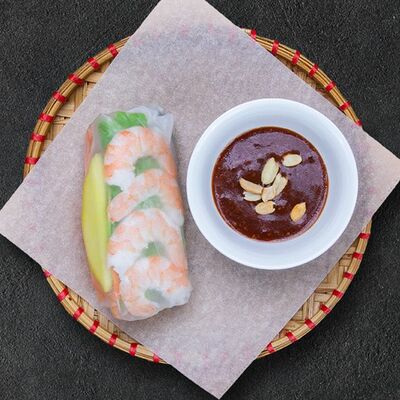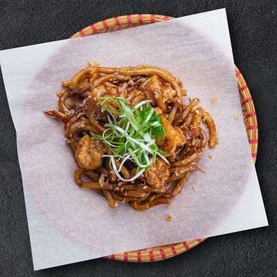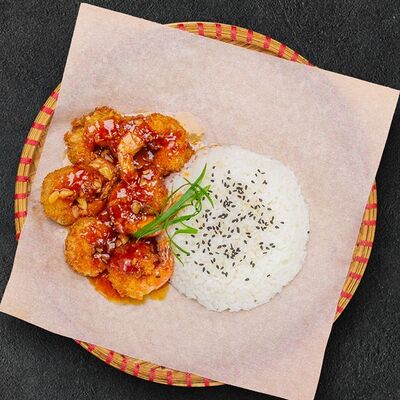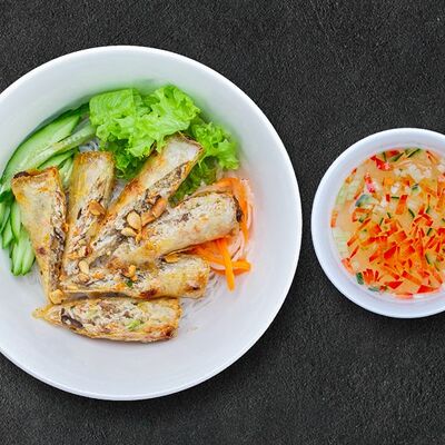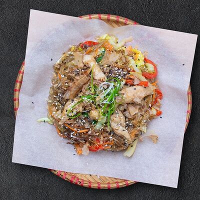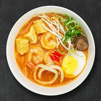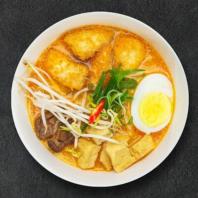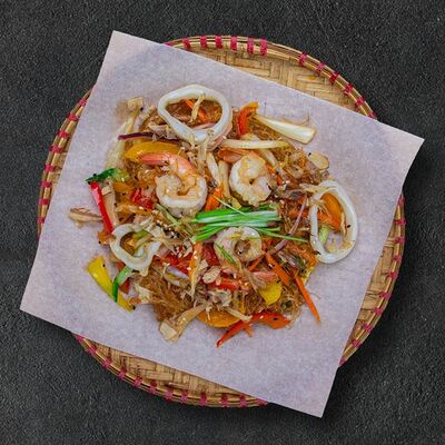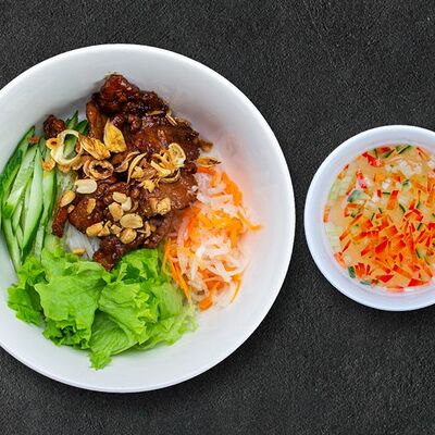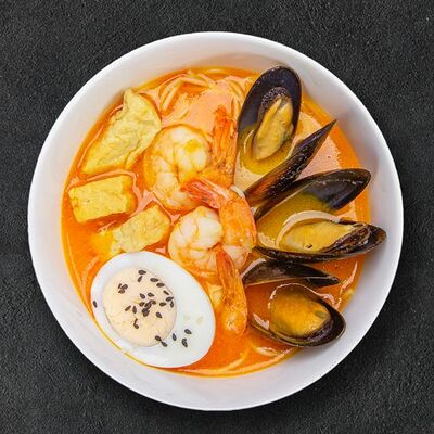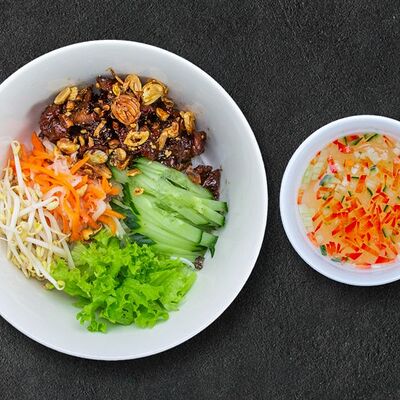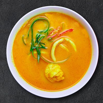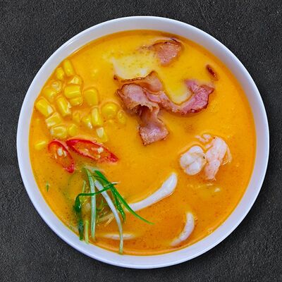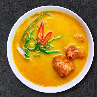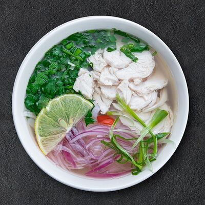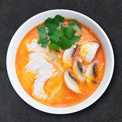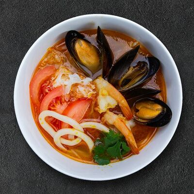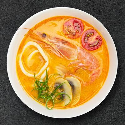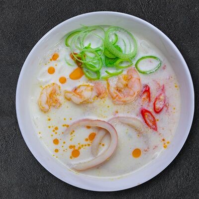 Кокосовое молоко, лемонграсс, вьетнамский корень галангал, лимонный лист, рыбный соус, перец чили, бульон, тигровые и салатные креветки, кальмары, лимон, шампиньоны, зелень. Подается на выбор с рисовой вермишелью бун или вьетнамским рисом