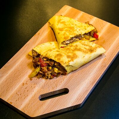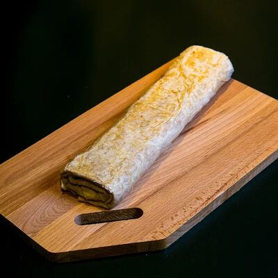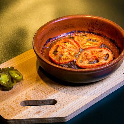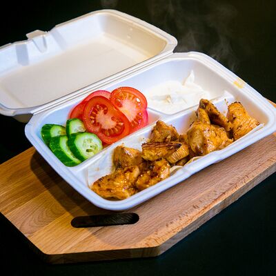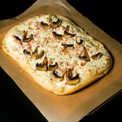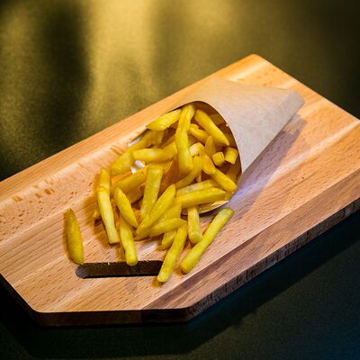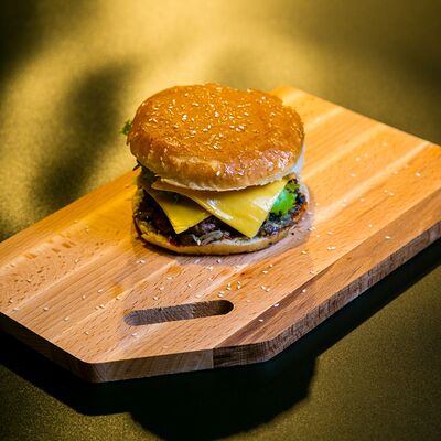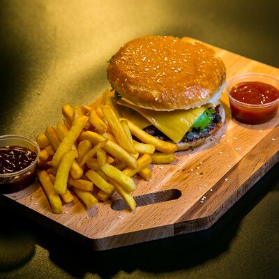 Булка, барбекю соус, грибная смесь со сливками, сыр, фарш из говядины, помидоры, лист салат. Дополнительное: картофель фри, барбекю соус