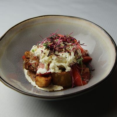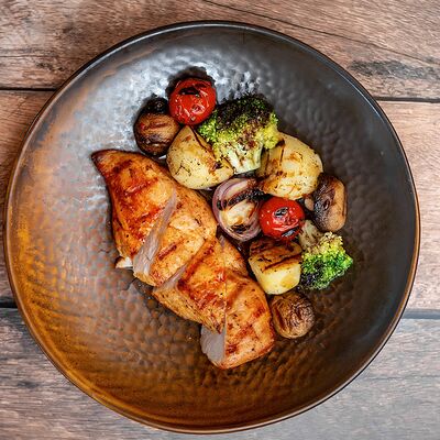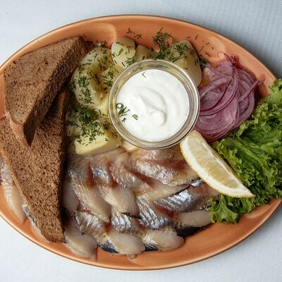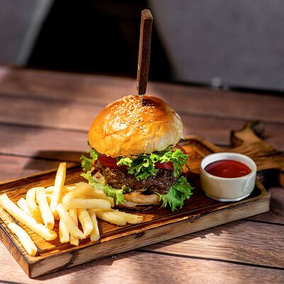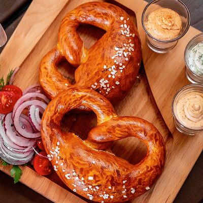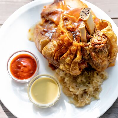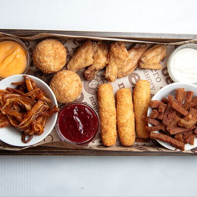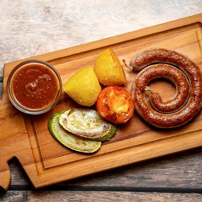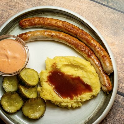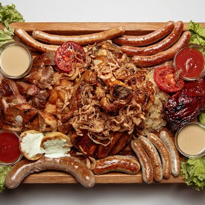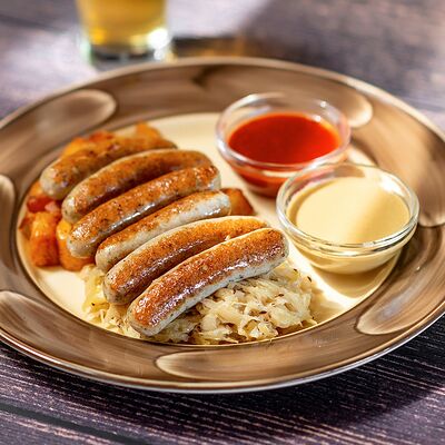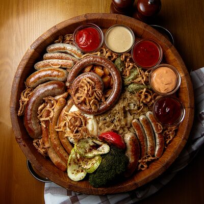 Колбаса (хаммельринг, нюрнбергская, копченая из говядины, из индейки и курицы, острая с сыром чеддер), овощи на гриле, пюре картофельное, немецкая кислая капуста, картофель, жаренный с беконом, соусы (демиглас, гриль, острый)