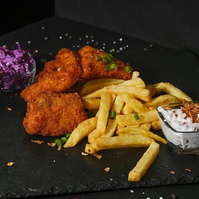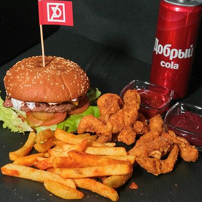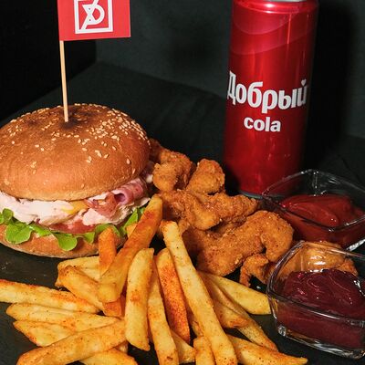 Чизбургер, куриные стрипсы, картофель фри, Добрый cola