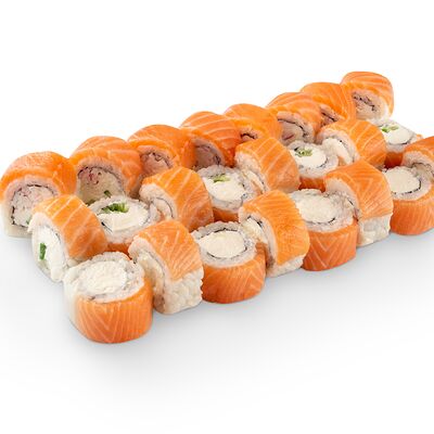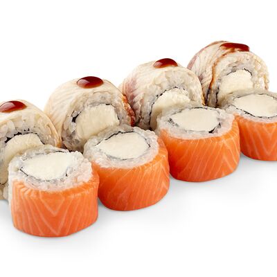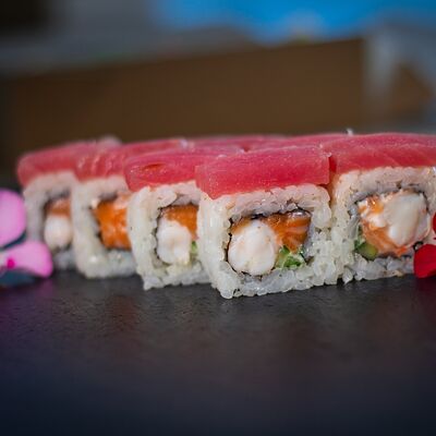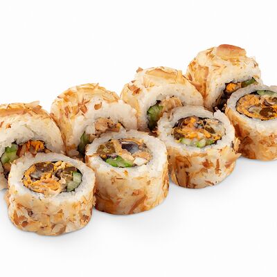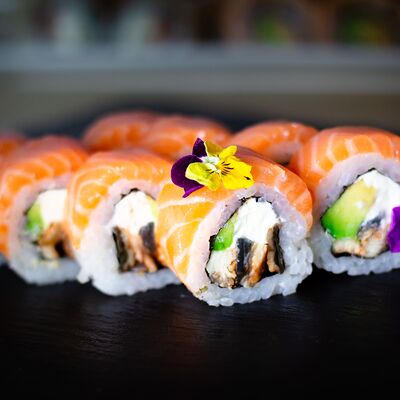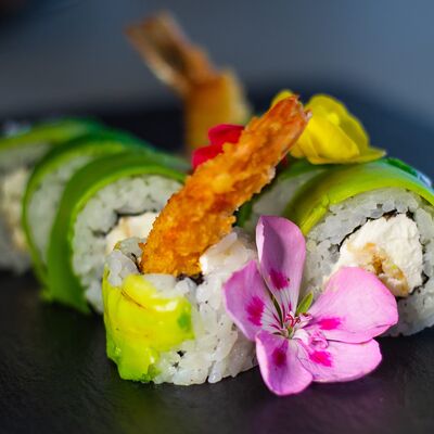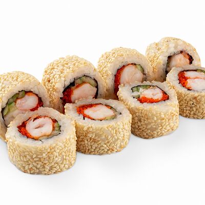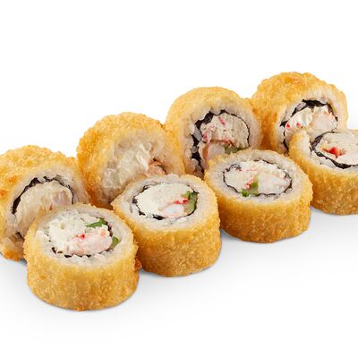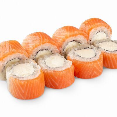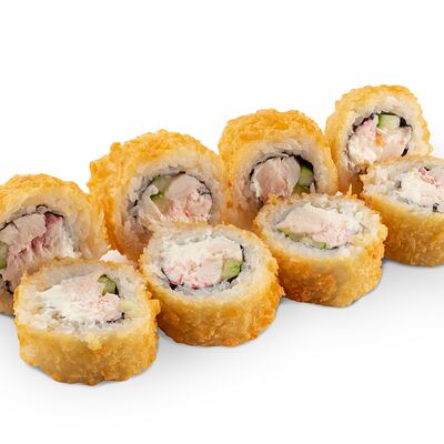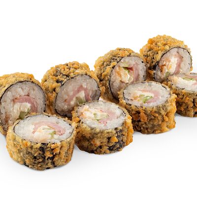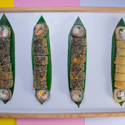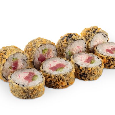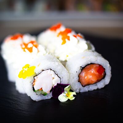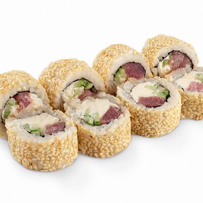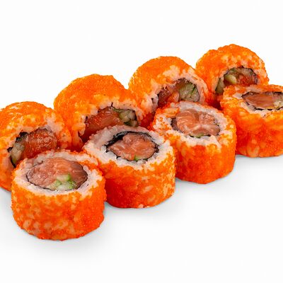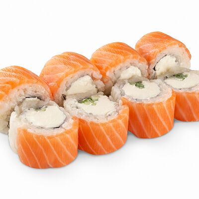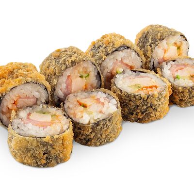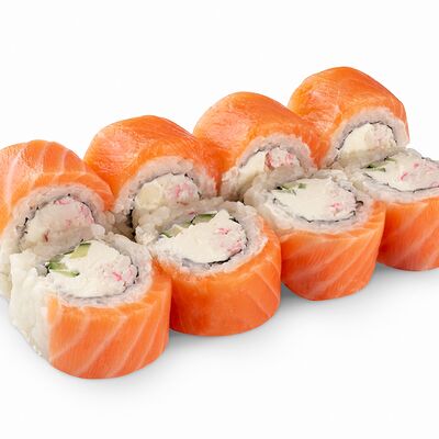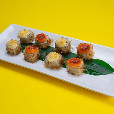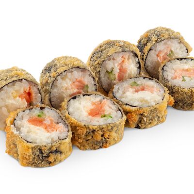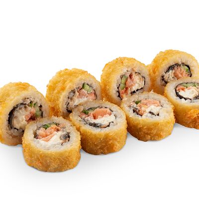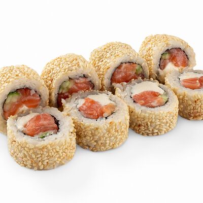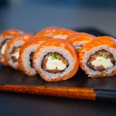 Лосось в сочетании с творожным сыром и хрустящим огурчиком в воздушном рисе и лососе