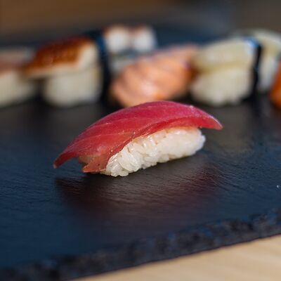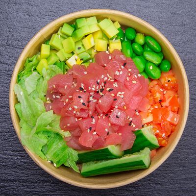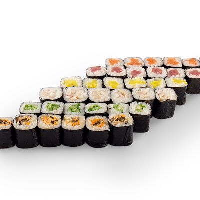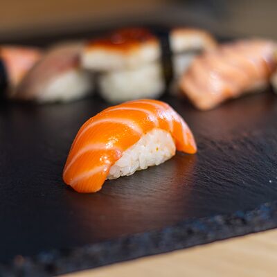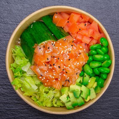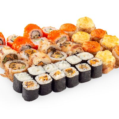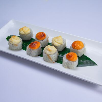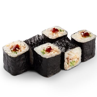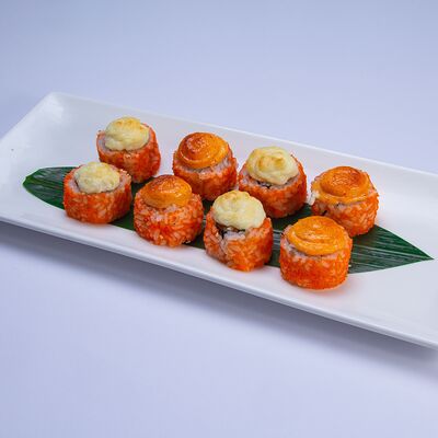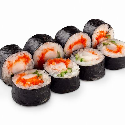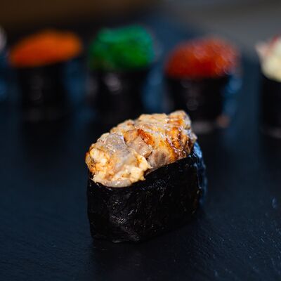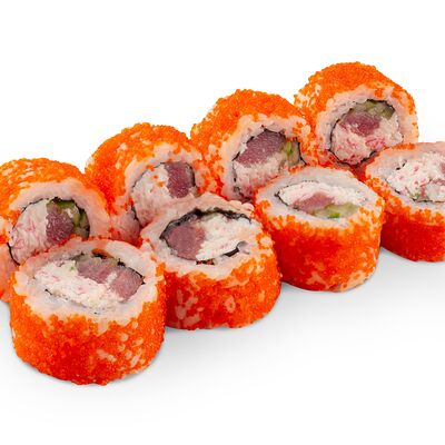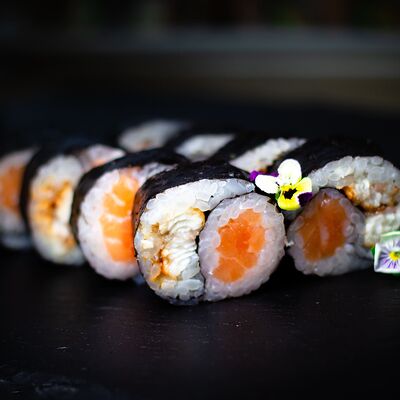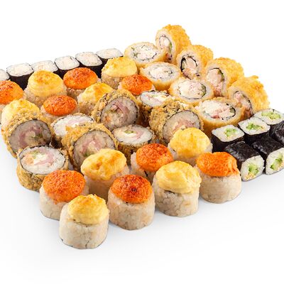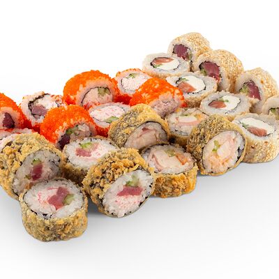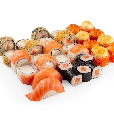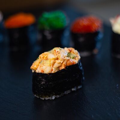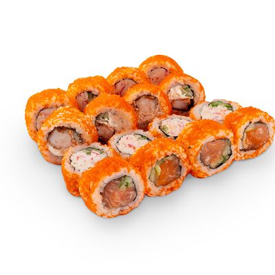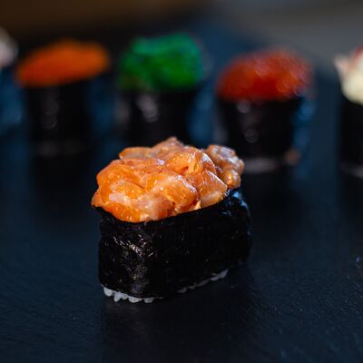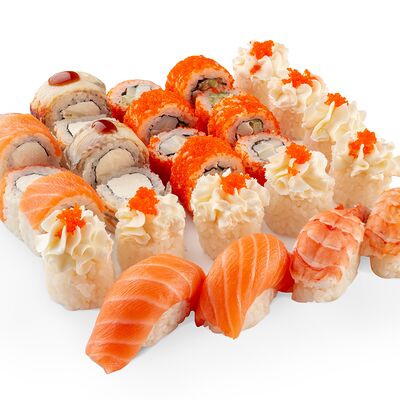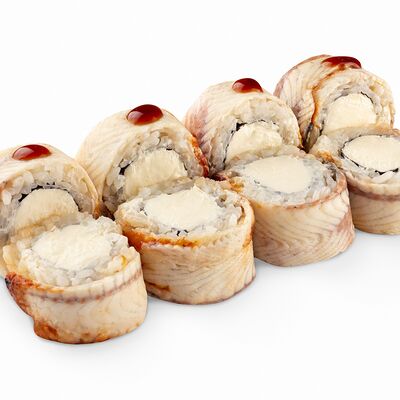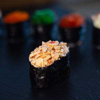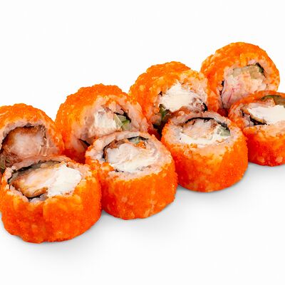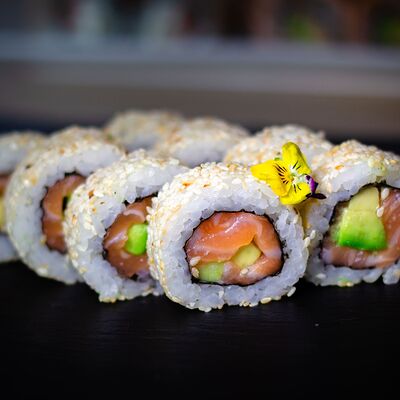 Лосось в сочетании с творожным сыром и хрустящим огурчиком в воздушном рисе и лососе