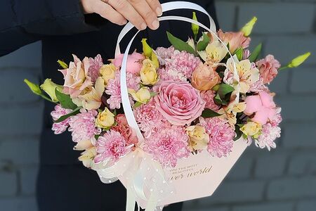 Нежная композиция из кустовых хризантем, альстромерии, розы и хлопка в стильной сумочке.
