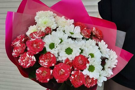 Яркий букет из кустовой розы и хризантемы в упаковке.