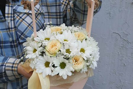 Композиция из ванильной кустовой розы и белоснежной ромашковой хризантемы, которые отлично дополняются воздушной гипсофилой.