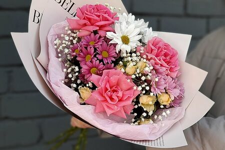 Яркий букетик с розами и кустовой хризантемой в дизайнерской упаковке.