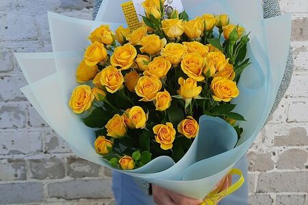Букет из ярко-желтых кустовых роз в упаковке.