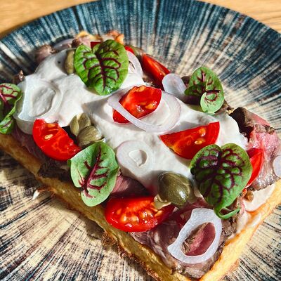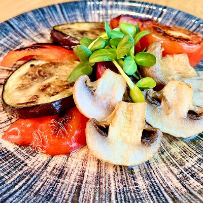 Молодой картофель, бекон, томаты черри, перец болгарский, салат романо, соус медово-горчичный