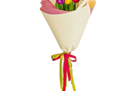 Яркий и красочный букет из разноцветных тюльпанов наполнен оптимизмом и весенним настроением! Упаковка и атласный бант придают букету нотку романтики.