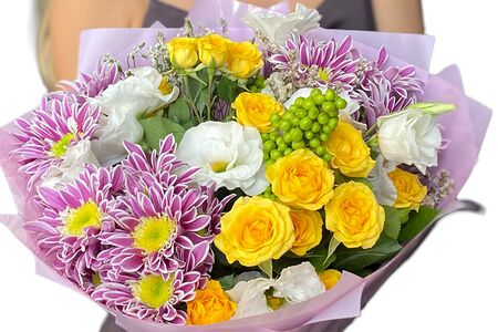 Хризантема кустовая розовая - 3 шт., Роза кустовая - 3 шт., Эустома - 2 шт., Статица - 3 шт., Сезонная зелень - 2 шт., Современная упаковка - 3.1 шт., Лента атласная - 1 шт.
