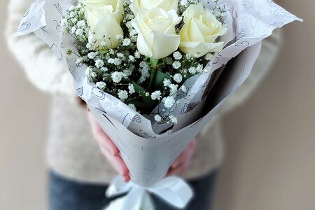 Роза 50 см (РОССИЯ) - 5 шт., Гипсофила - 1 шт., Лента атласная - 1 шт., Современная упаковка - 1 шт.