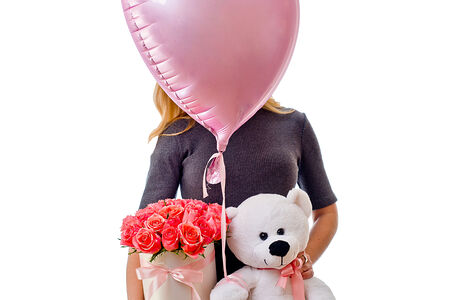 Нежнейшая шляпная коробка превосходных роз, чудесный плюшевый мишка и сердце горящее любовью, что еще лучше расскажет о ваших чувствах?
