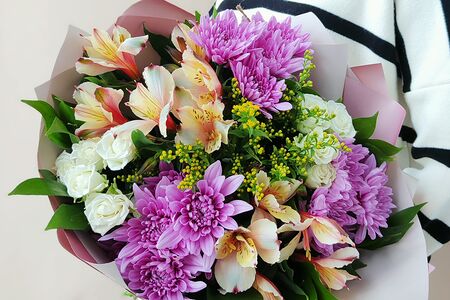 Хризантема кустовая - 3 шт., Альстромерия - 2 шт., Роза кустовая - 2 шт., Солидаго - 1 шт., Русскус отеч. - 8 шт., Лента атласная - 1 шт., Современная упаковка - 1 шт.