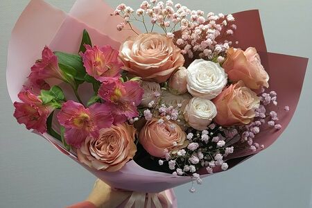 Букет розы пионовидной кахалы, альстромерии и гипсофилы создаст уют в комнате ваших родных Указаны примерные размеры, чтобы вы могли представить внешний вид и масштаб, но фактически размеры могут немного отличаться.
