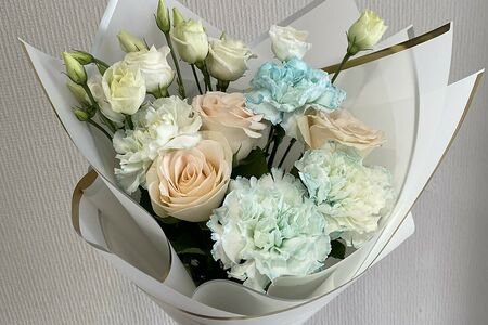 Состав: Диантус - 4; Роза - 3; Лизиантус (Эустома) - 2. Ширина: 21см. Высота: 49см.