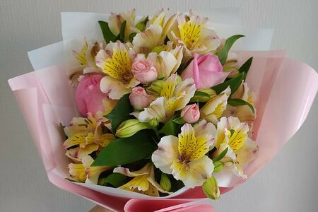 Состав: Альстромерия - 4; Роза - 2; Роза кустовая - 1; Пленка - 3. Ширина: 20см. Высота: 50см.