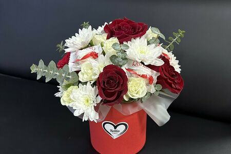Состав: Эвкалипт - 6; Роза - 5; Роза кустовая - 3; Хризантема кустовая - 3; Шляпная коробка - 1. Ширина: 28см. Высота: 30см.