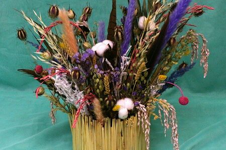Состав: Грин Белл Сухоцвет - 400; Заснеженные ветки - 300; Статица Сухоцвет - 200; Сухоцвет Микс - 200; Мох - 100; Фаларис - 50; Рис - 13; Колос Окрашенный Сухоцвет - 10; Камыш Окрашенный Сухоцвет - 6; Рожь - 6; Рудбекия Сухоцвет - 4; Нигелла Сухоцвет - 4; Краспедия Сухоцвет - 3; Хлопок - 3; Перо фазана - 3; Чика Сухоцвет - 2; Шляпная коробка - 1; Оазис - 1. Ширина: 40см. Высота: 40см.