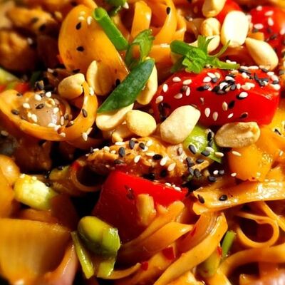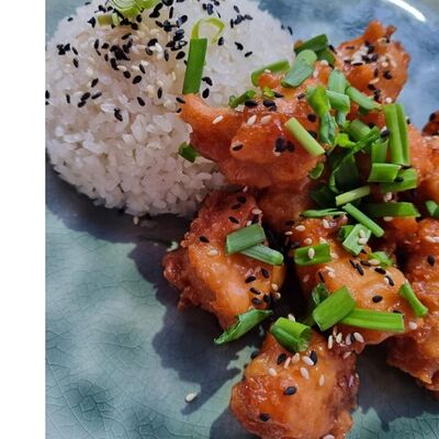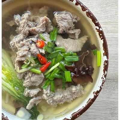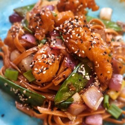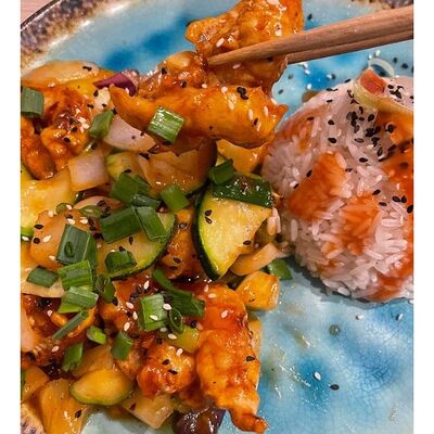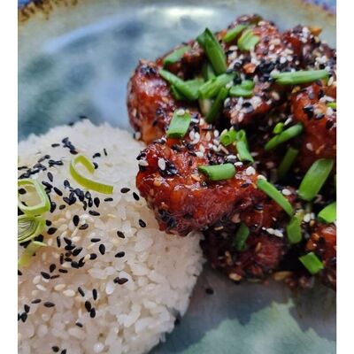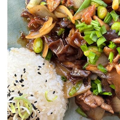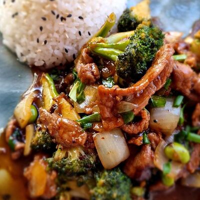 Кусочки говядины, обжаренные в воке с бок-чой, побегами бамбука, луком, имбирём, чесноком и острым соусом из чёрных бобов. Подаётся с белым рисом или лапшой
