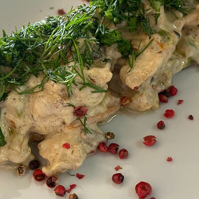Куриное филе, картофель, масло подсолнечное, шампиньоны, лук, морковь, помидоры, сливки, зелень, чеснок