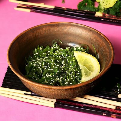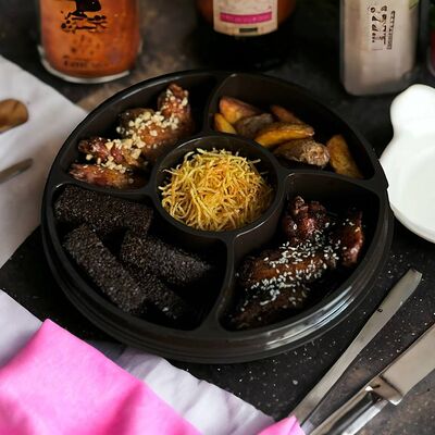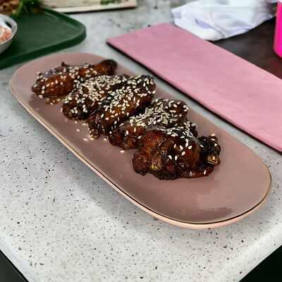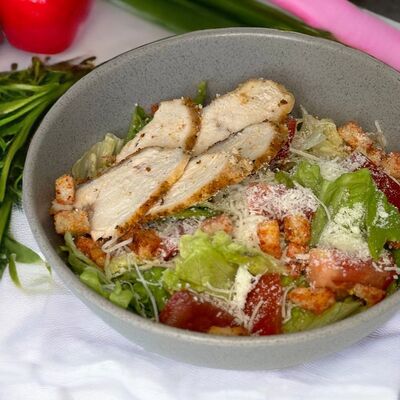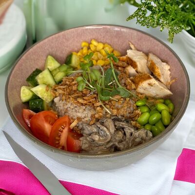 Курочка запеченная, грибной жульен, бобы эдамаме, огурцы, помидор, кукуруза, лук фри, гречка, микрозелень, соус соевый. Кбжу: 272/26,2/7,8/24,2