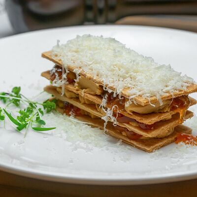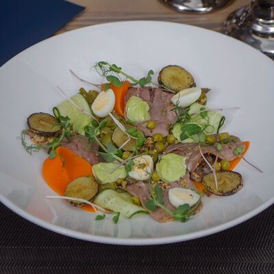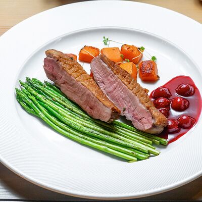 Утиное филе, спаржа, масло оливковое, вишня, вино красное, сахар, гвоздика, анис