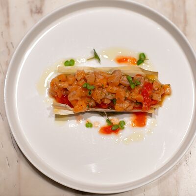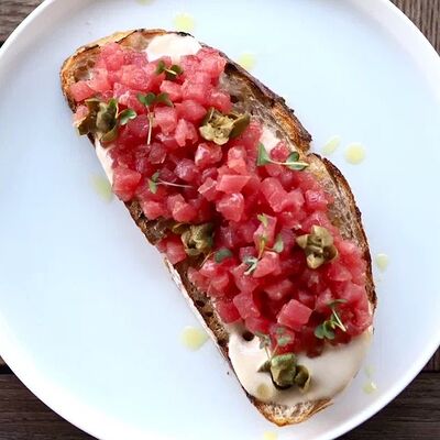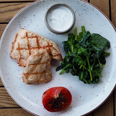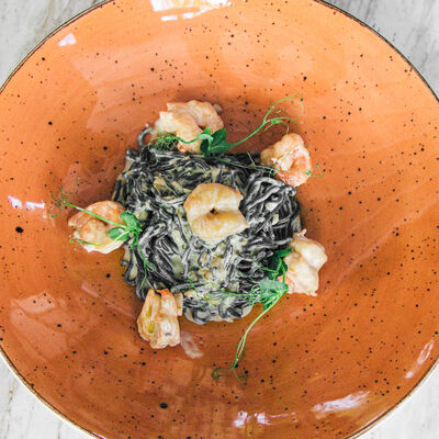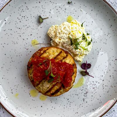 Креветки, масло оливковое, чеснок, орегано, лист салата айсберг, помидоры черри, сыр пармезан, майонез, анчоусы, соус красный дьявол, соус ворчестер, сок лимона, каперсы, батон
