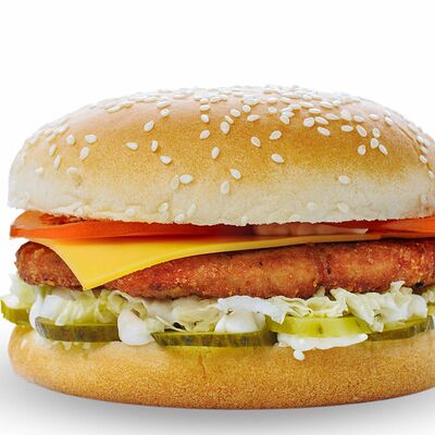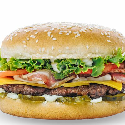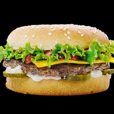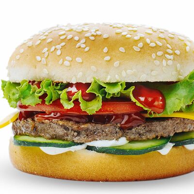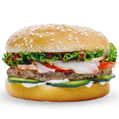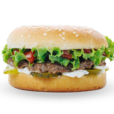 Булка с кунжутом, соленый огурец, лук, салат, кетчуп, майонез, говяжья котлета