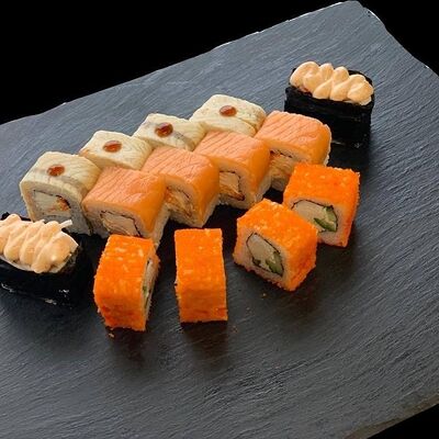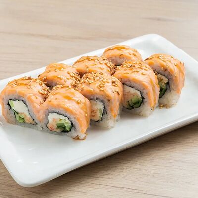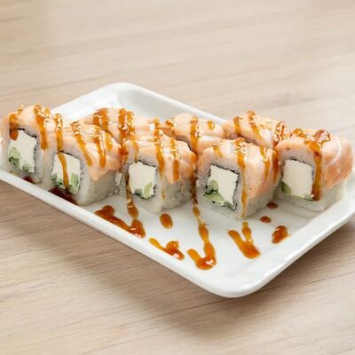 Лосось, спайси соус, сыр, омлет, унаги соус, кунжут