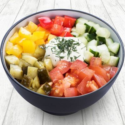 Курица жареная, огурец свежий, морковь по-корейски, перец болгарский свежий, соус белый сливочный