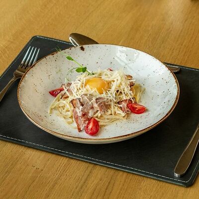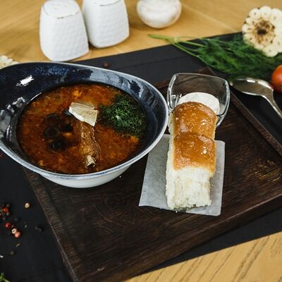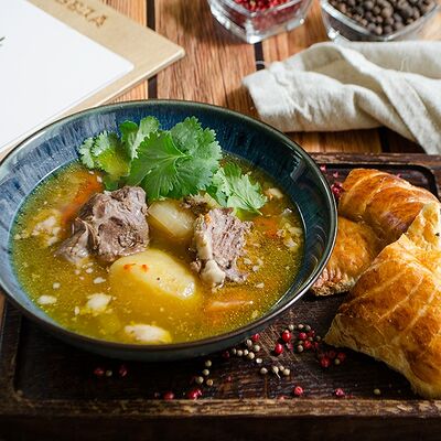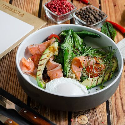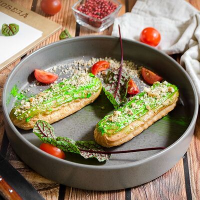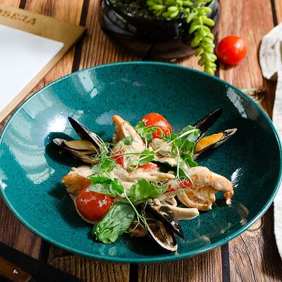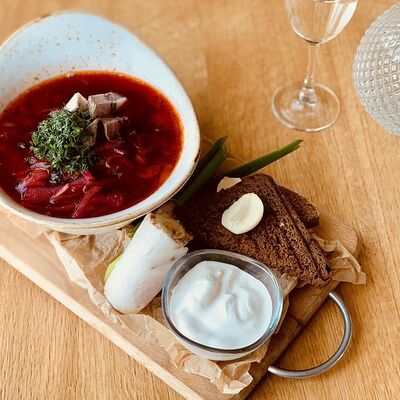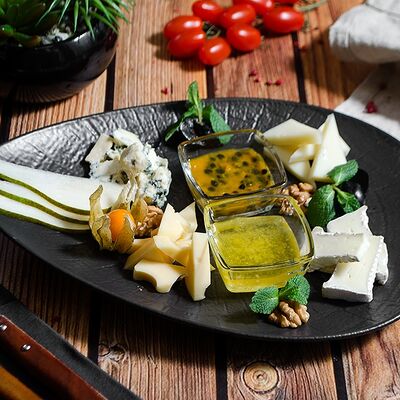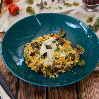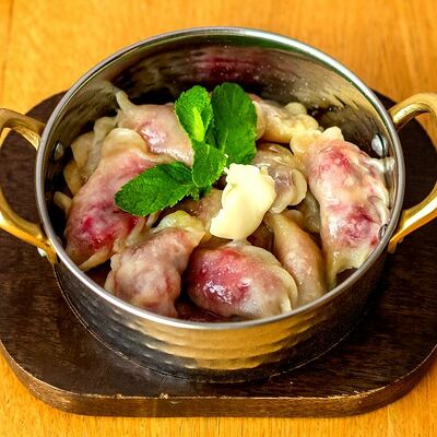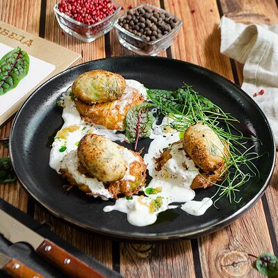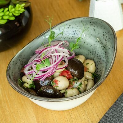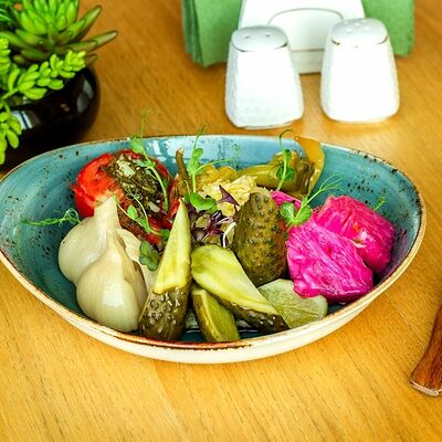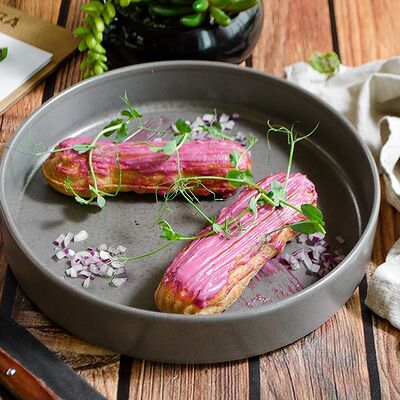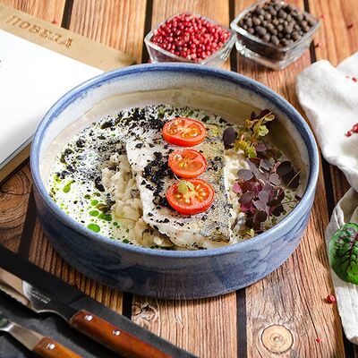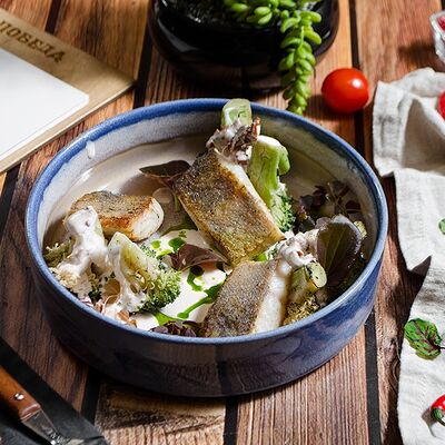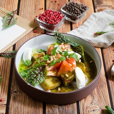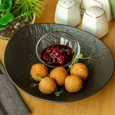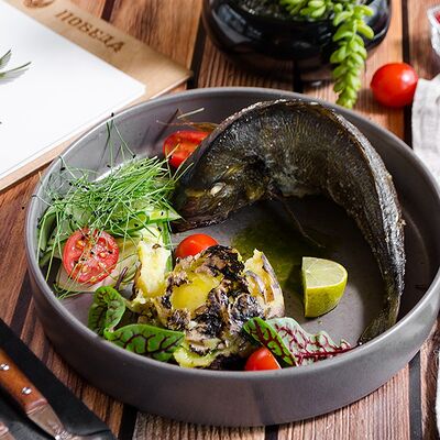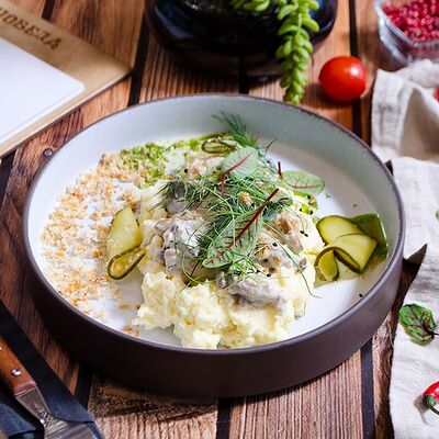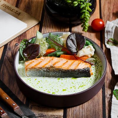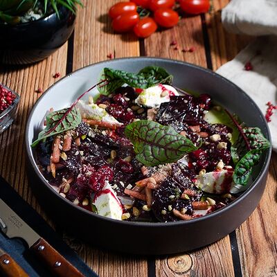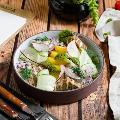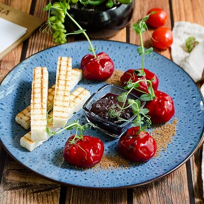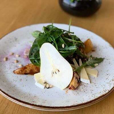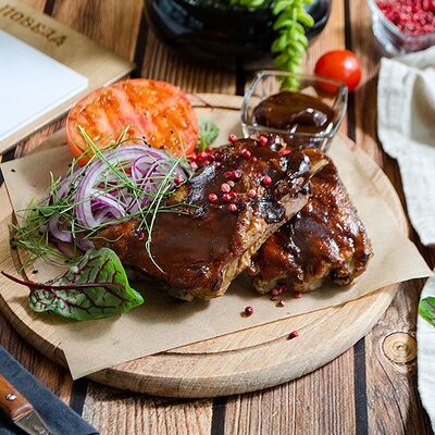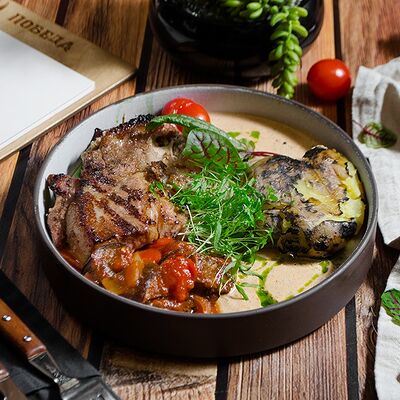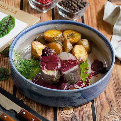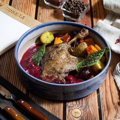 Утиная ножка в конфи из яблока и кизила, подается с паровыми овощами (картофель, свекла, морковь, тыква)