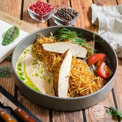 Котлеты обжариваются до золотистой корочки, на порцию идет три штуки небольшого размера. Гарнир - драники из картофеля, щучья икра со сливками