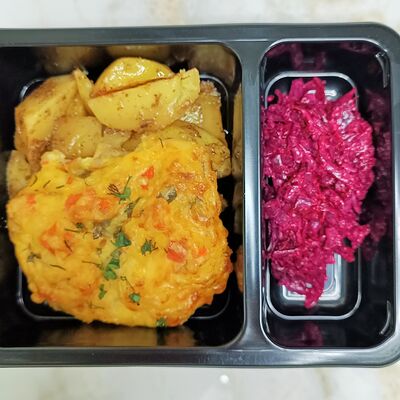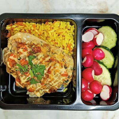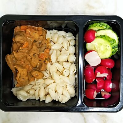 Куриные желудки, лук, морковь, шампиньоны, специи
