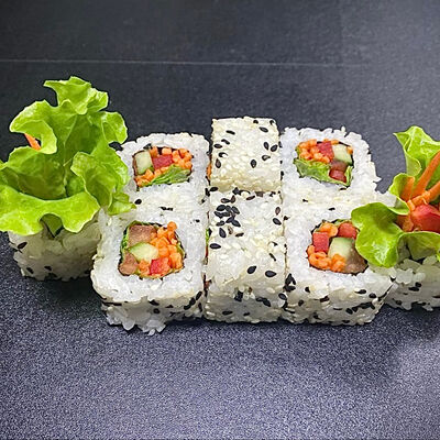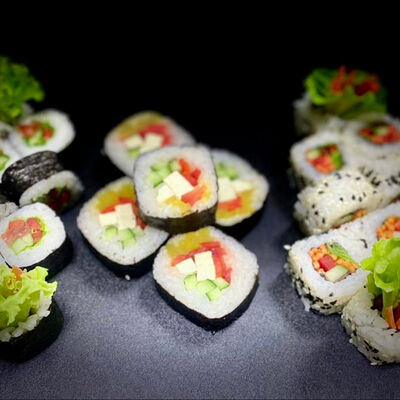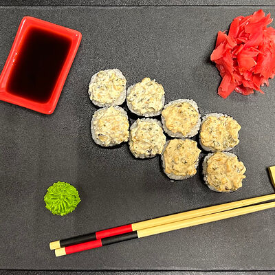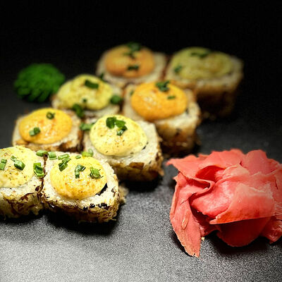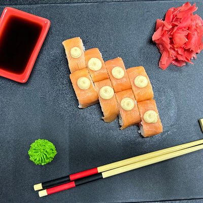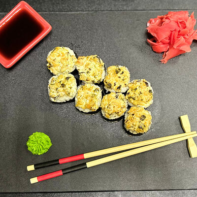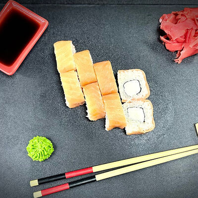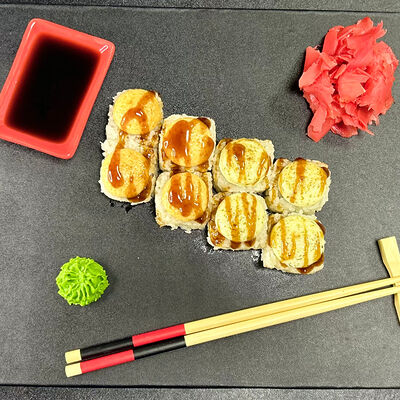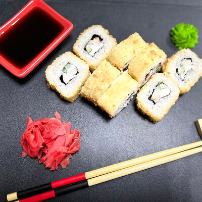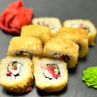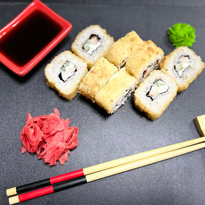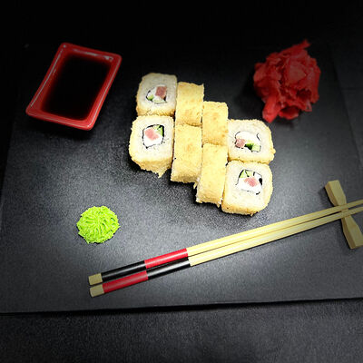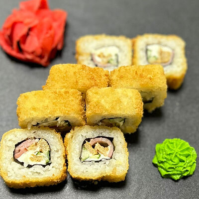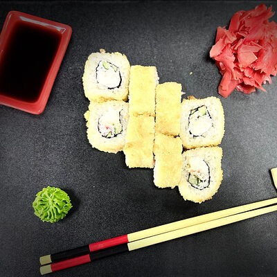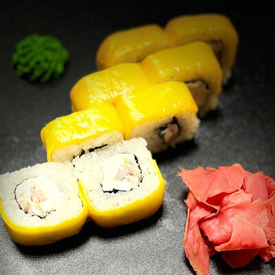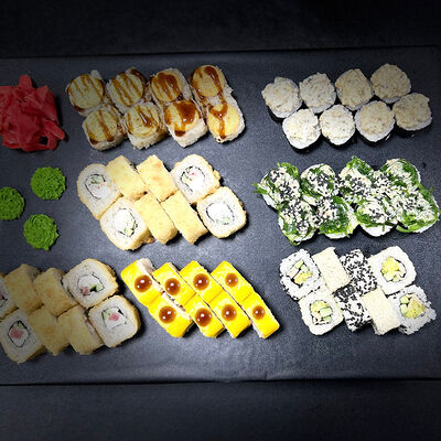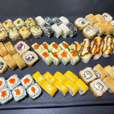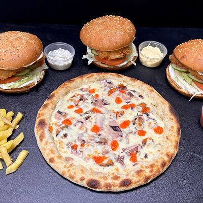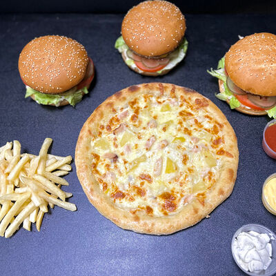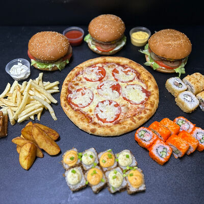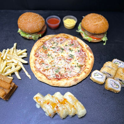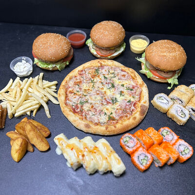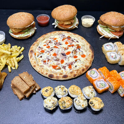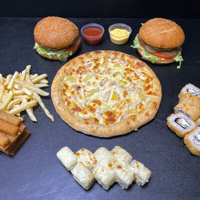 Пицца курица с ананасом (30 см), бургер с куриным стейком (3 шт.), ролл Темпура чикен (1 порция), ролл Чикен чиз (1 порция), ролл Калифорния краб (1 порция), картошка фри (1 порция), картошка по-деревенски (1 порция), гренки чесночные (1 порция), чесночный соус (30 г), сырный соус (30 г), домашний кетчуп (30 г), соевый соус (90 г), имбирь (30 г), васаби (30 г), палочки для роллов (3 пары)