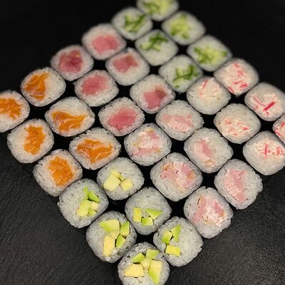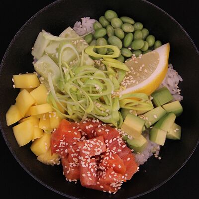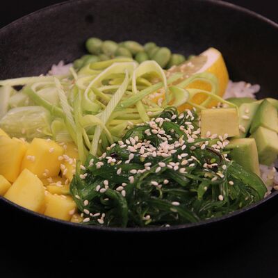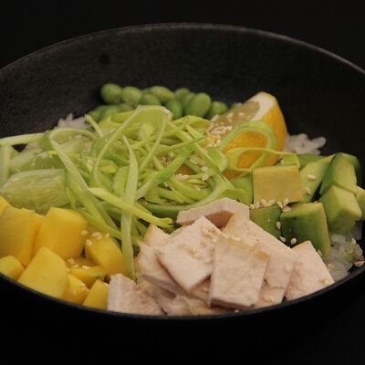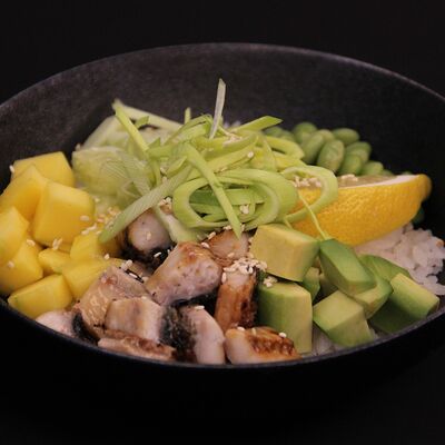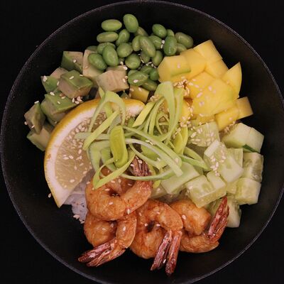 Рис, креветки тигровые, масло, манго, лимон, лук порей, огурец, авокадо, кунжут, бобы эдамаме, соус