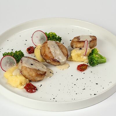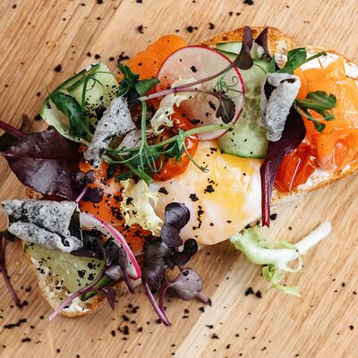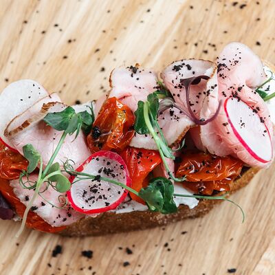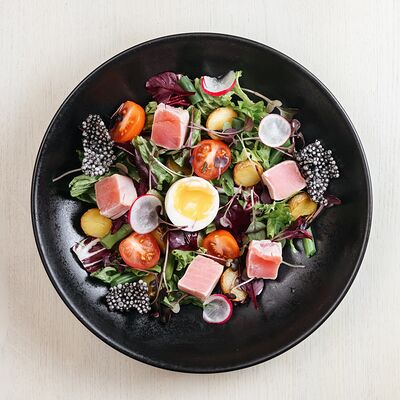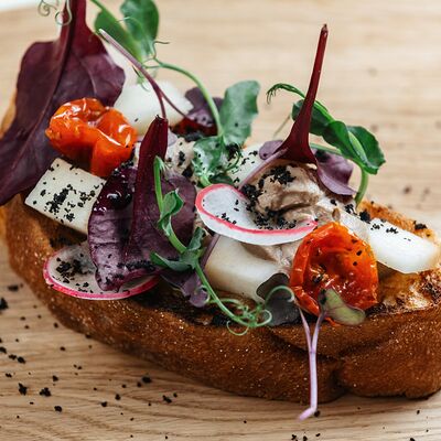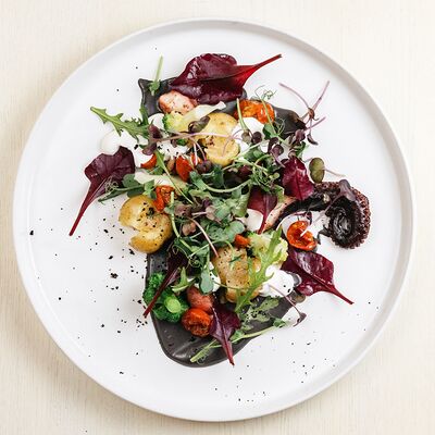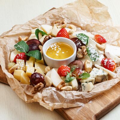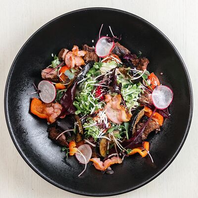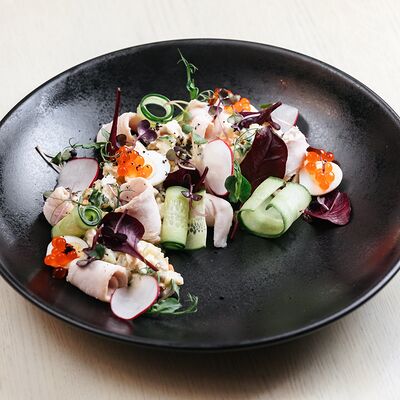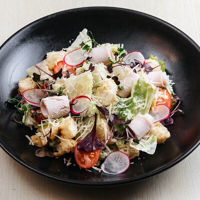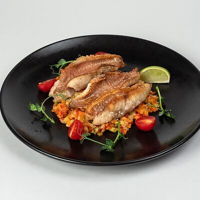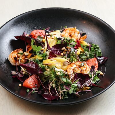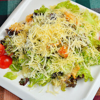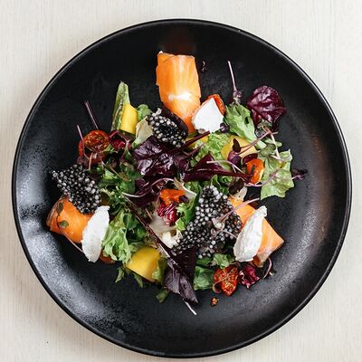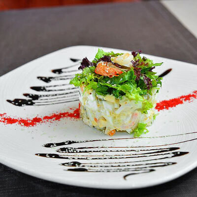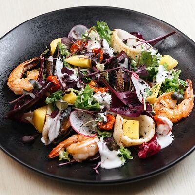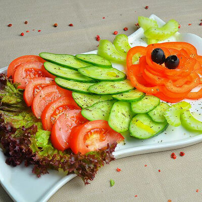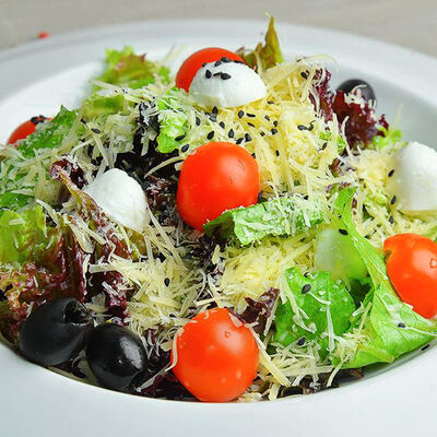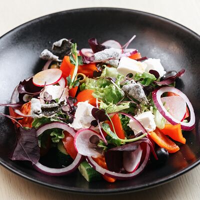 Помидоры, огурцы, перец болгарский, микс салата, заправка цитрусовый соус с добавлением бальзамика, редис, сыр брынза, маслины, чипсы из морских водорослей