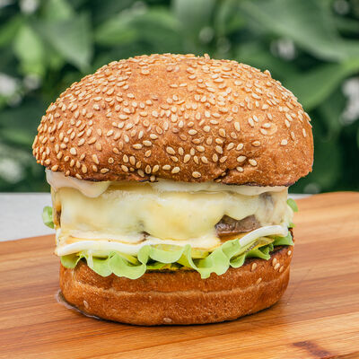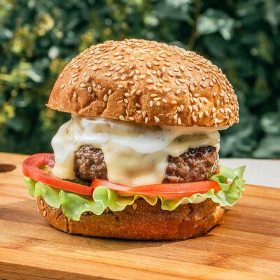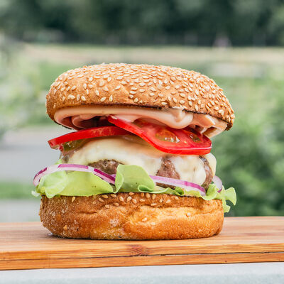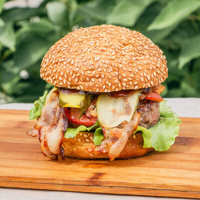 Котлета из мраморной говядины, сыр, лист салата, огурец, помидор, красный лук