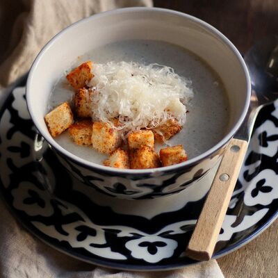 Грибы шампиньоны, лук репчатый, картофель, бульон куриный, сливки 22%