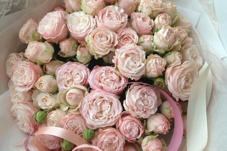 Состав: Роза пионовидная кустовая - 15; Лента - 2; Пленка матовая - 1; Тишью - 1. Ширина: 35см. Высота: 50см.