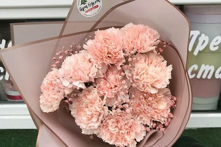 Состав: Диантус - 9; Гипсофила - 1; Упаковка - 1; Лента - 1. Ширина: 35см. Высота: 50см.