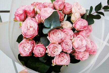 Нежная кустовая роза сорта бомбастик с нотками ароматного эвкалипта и в легкой полупрозрачной упаковке. Указаны примерные размеры, чтобы вы могли представить внешний вид и масштаб, но фактически размеры могут немного отличаться.