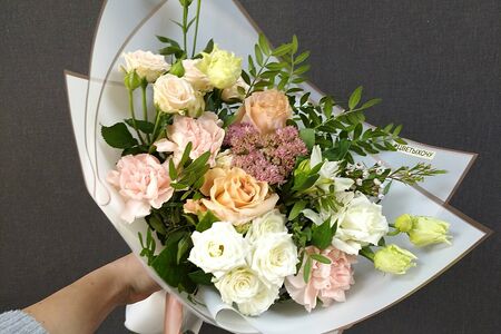 Состав: Диантус - 3; Роза кустовая - 2; Лизиантус (Эустома) - 2; Фисташка - 2; Роза - 2; Альстромерия - 1; Пленка матовая - 1. Ширина: 45см. Высота: 50см.