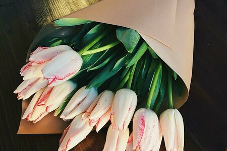 Состав: Тюльпан - 11; Дизайнерская упаковка - 1; Лента - 1. Ширина: 25см. Высота: 50см.