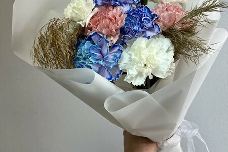 Состав: Диантус - 9; Сухоцветы - 2; Дизайнерская упаковка - 1. Ширина: 30см. Высота: 45см.