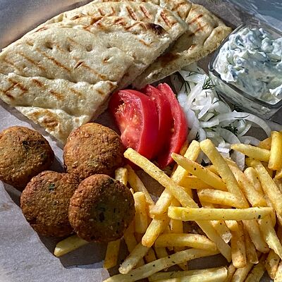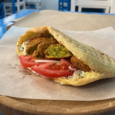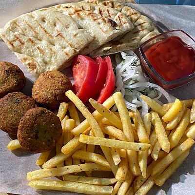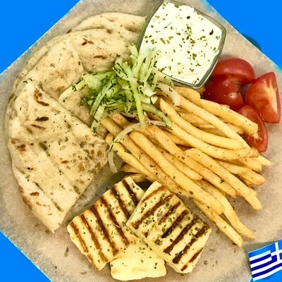 Помидор, огурец, греческая фета, оливки с косточкой, красный лук, оливковое масло, орегано