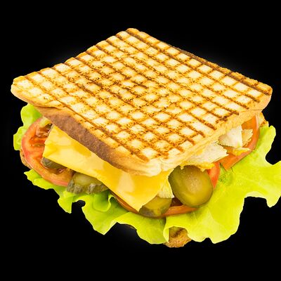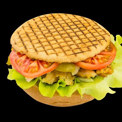 Курица, огурец, помидор, огурец маринованный, перец маринованный, картофель фри, чесночный соус, кетчуп, лаваш белый
