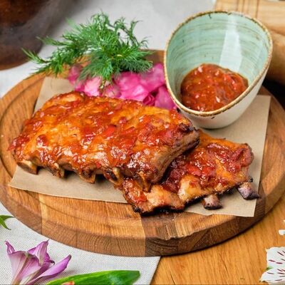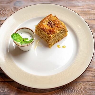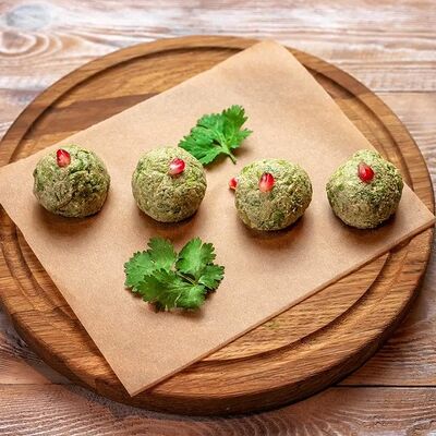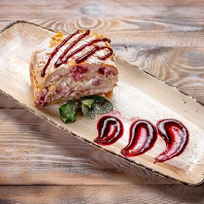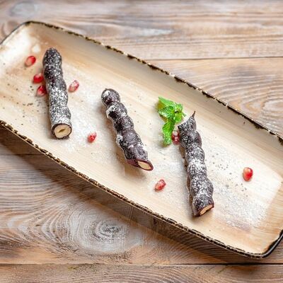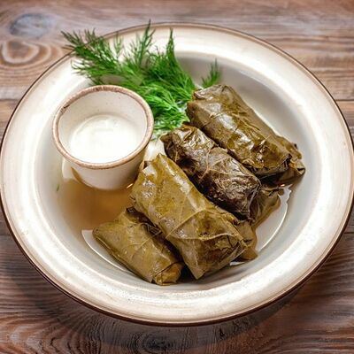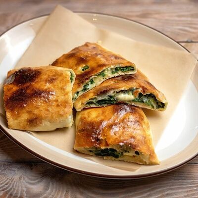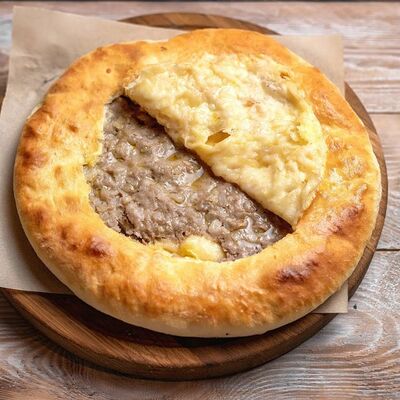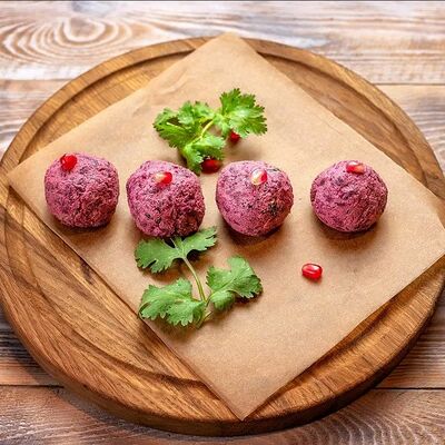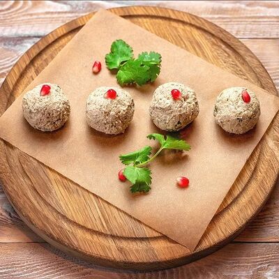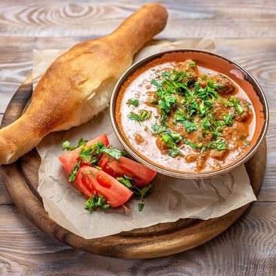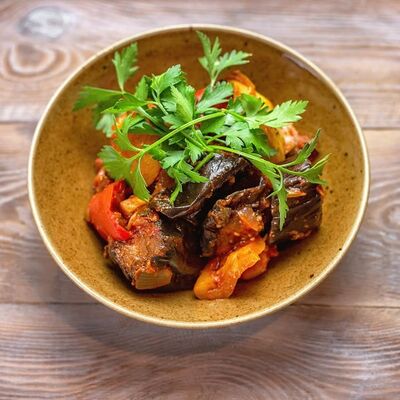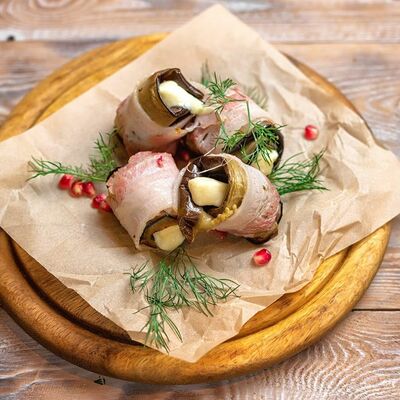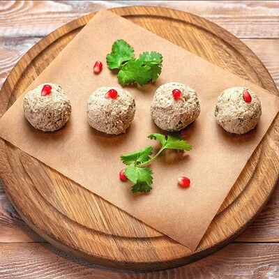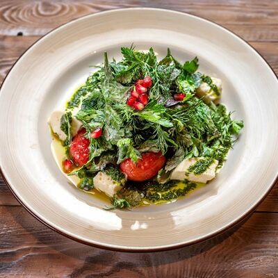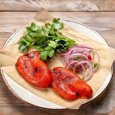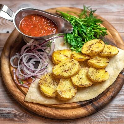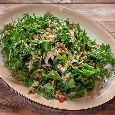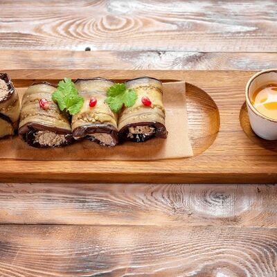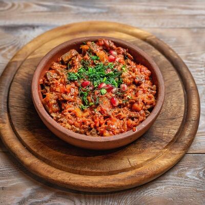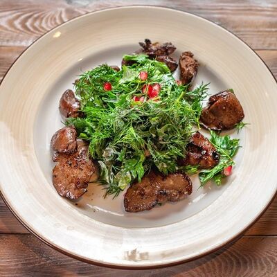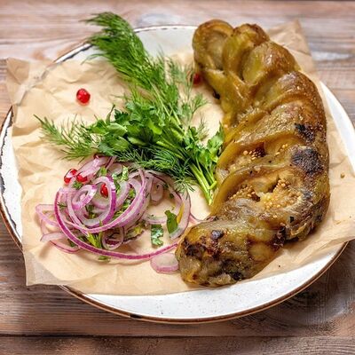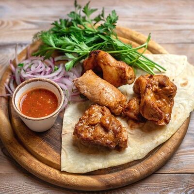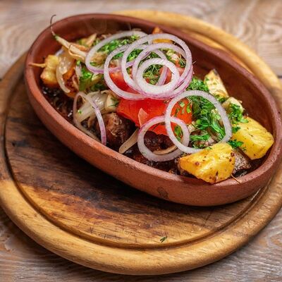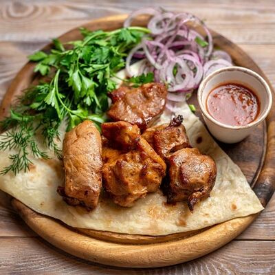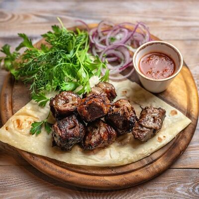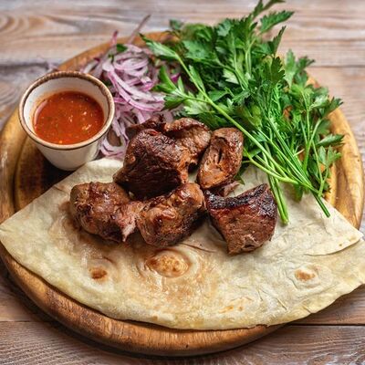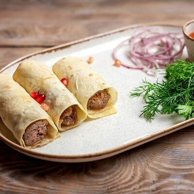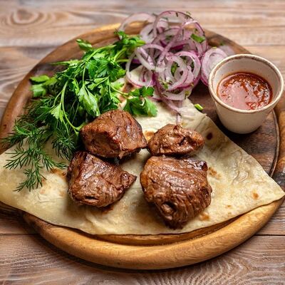 Говяжья печень в бараньей сетке с ароматными специями, зеленью, маринованным луком и соусом Сацебели. Подается на тонком лаваше