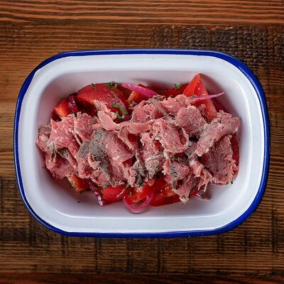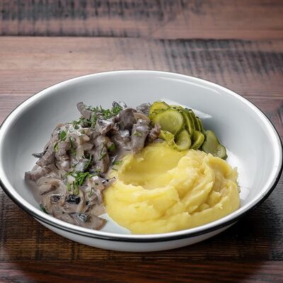 Ломтики ростбифа, тушеные в сливках с грибами шампиньонами и луком. Подается с картофельным пюре (картофель, молоко, соль) и соленым огурцом