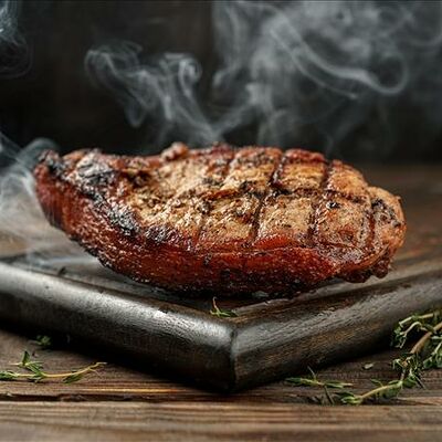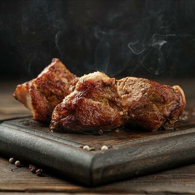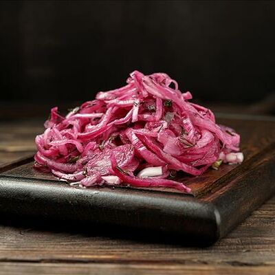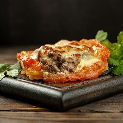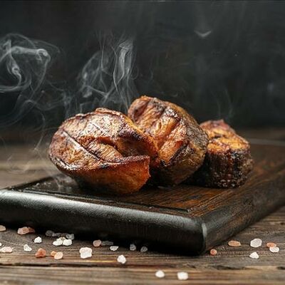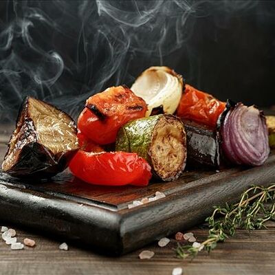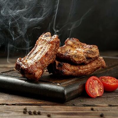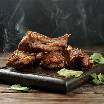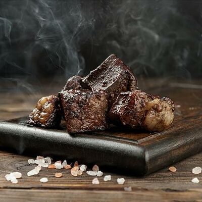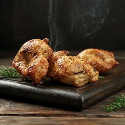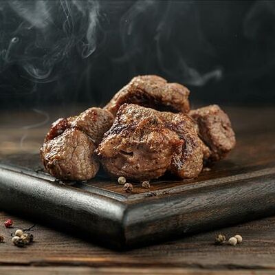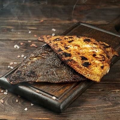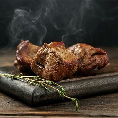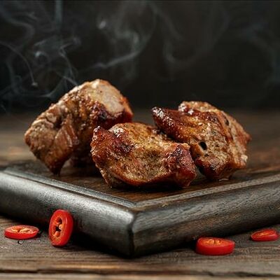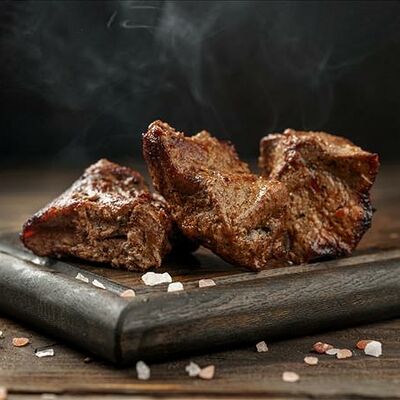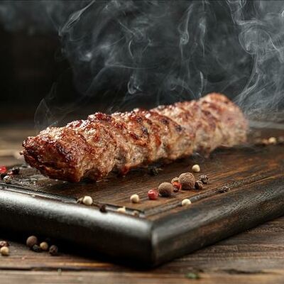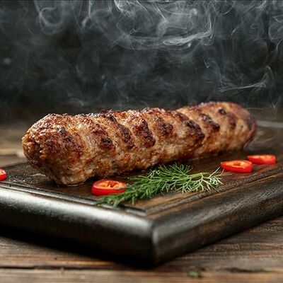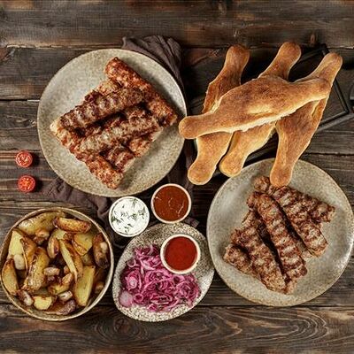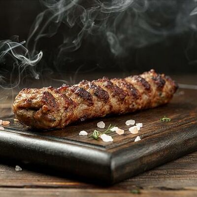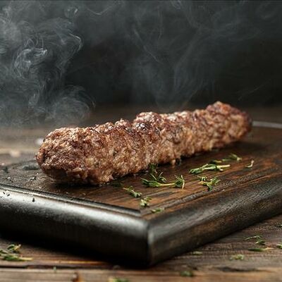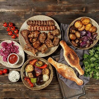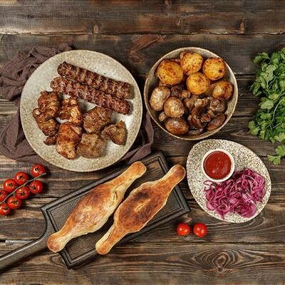 Традиционное блюдо на мангале из говяжьей печени, с добавлением курдюка, в маринаде из классических специй, подается с луком и фирменным томатным соусом