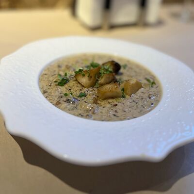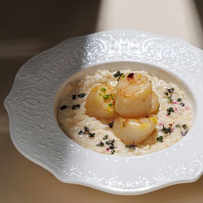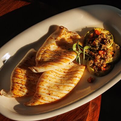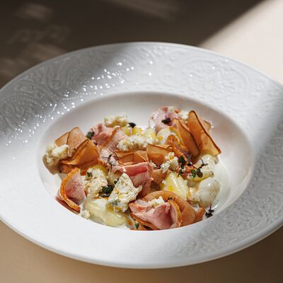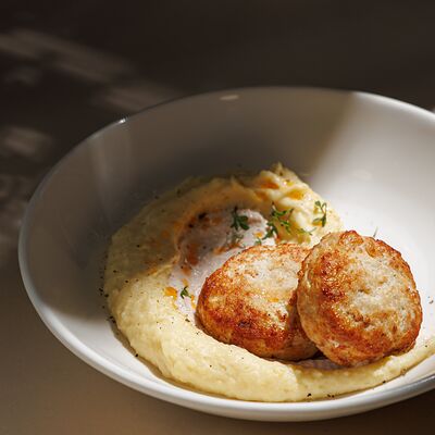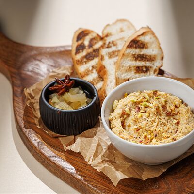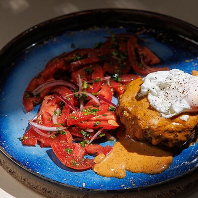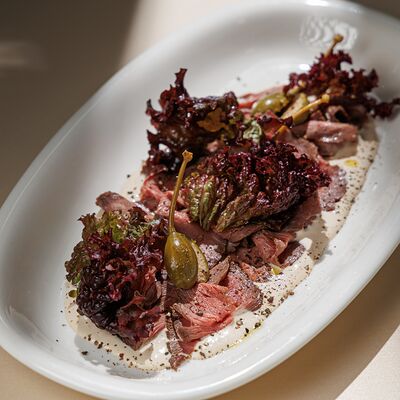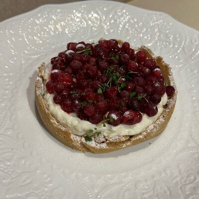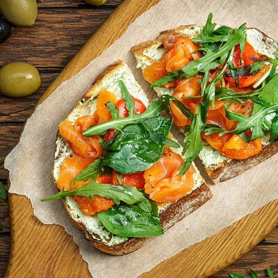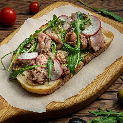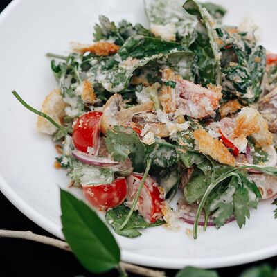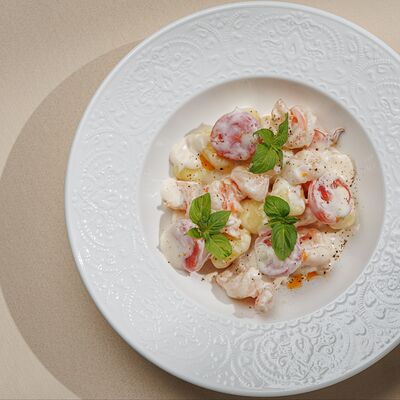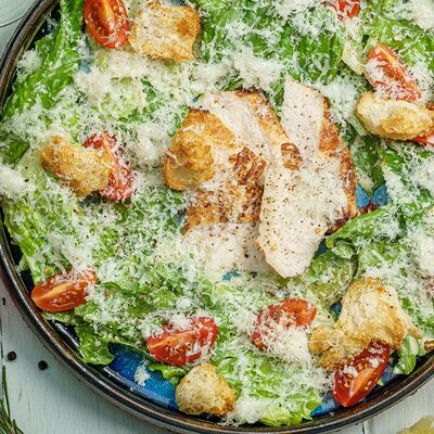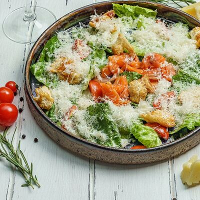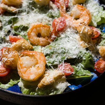 Свежий лист салата, соус цезарь, обжаренные креветки, пряные сухарики из белого хлеба, сыр пармезан